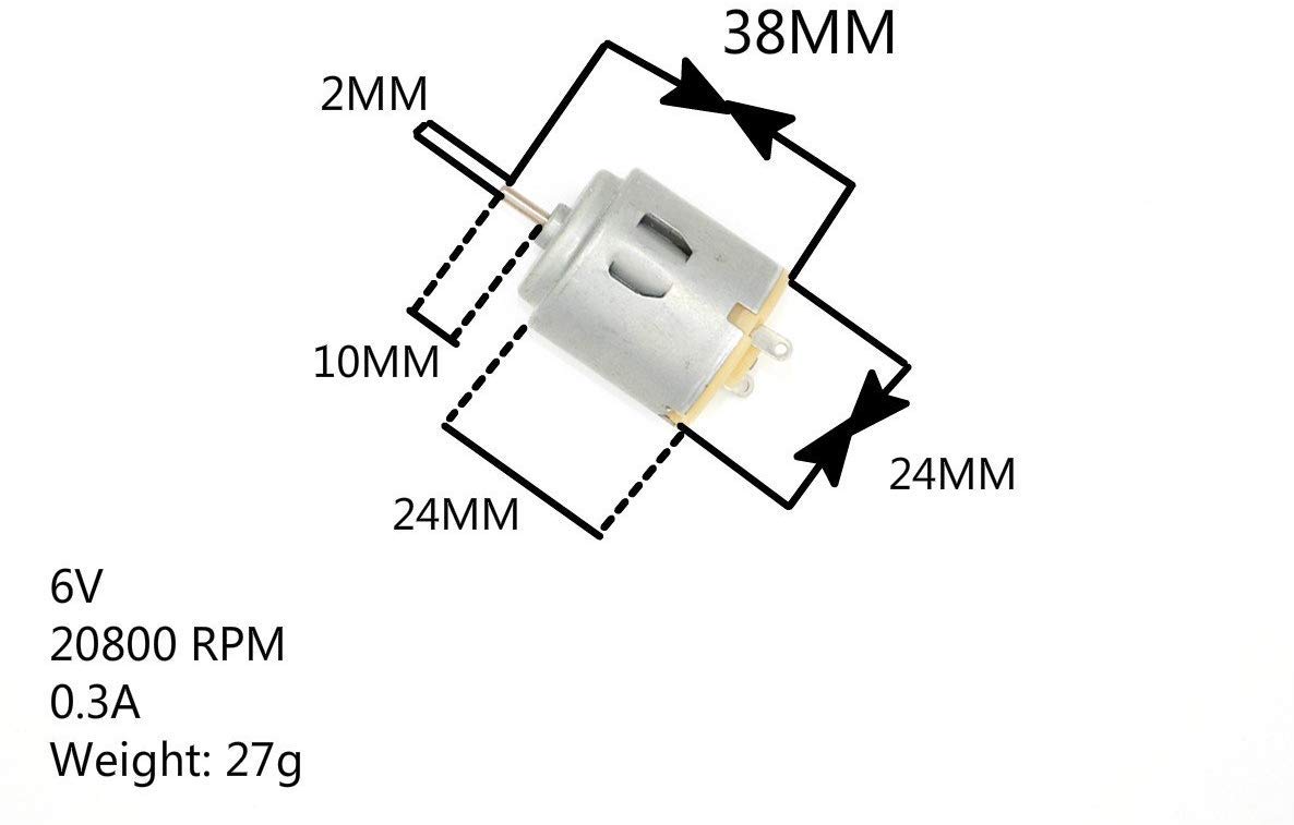 Used for electronic toys, car toys, robot, fan, electronic equipment, electronic game machine, etc Round Motor Diameter -Length: 23.8mm Diameter: 26.9mm, Shaft Diameter: 2mm Shaft Length: 8.8mm flat motor Diameter-24*18*27mm 2mm Shaft Length On/OFF, Control of Motor Using Provided Switches